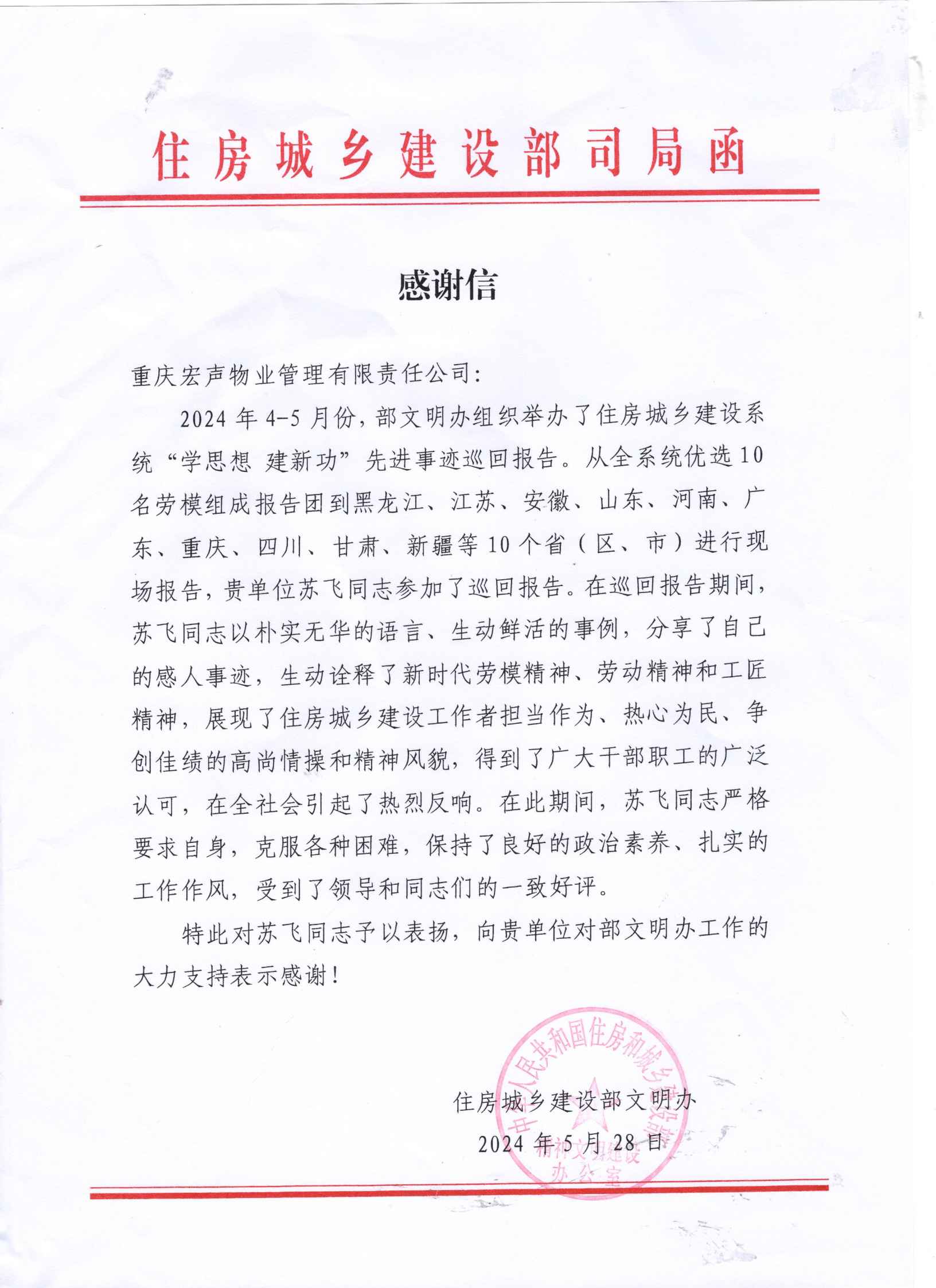 2024年(nián) 4-5月(yuè),住房(fáng)城(chéng)鄉(xiāng)建設部文(wén)明(míng)辦優選10名住建系統勞模組成報(bào)告團,組織舉辦了↔(le)“學思想 建新功”先進事(shì)迹巡回報(bào)告。報(bào)告團先後在廣東(dōng§)、重慶等10個(gè)省(區(qū)、市(shì))進行(xíng)現(xiàn)場(chǎng)報(bào)告,宏聲λ物(wù)業(yè)公司工(gōng)程維修主管蘇飛(fēi)全程參與。